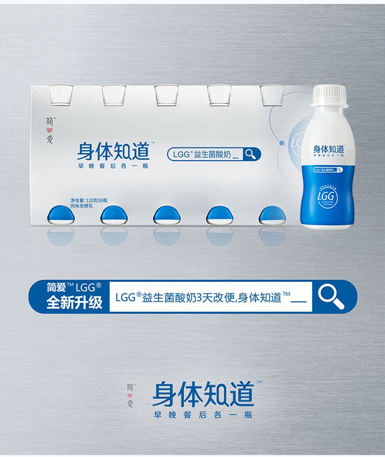 图片来源:冠益乳官方微博 “标识认知”的策略必须要下足本:只有电梯手机广告牌到处都能看到听到“小蓝帽”,看得到小蓝帽和免疫力的关联,才能在看到酸奶瓶上的小蓝帽时产生对免疫力的联想。 否则消费者很难从消费终端去解读小蓝帽的真正含义是什么,可能会和其他概念产生混淆。甚至会因为有“健康食品没那么好吃”这样的潜意识认知,使得他们看到一个象征健康食品的符号时,反而减低了食欲感。 2、细分场景:寡头包围的市场,如何用设计抢占新赛道? 如果说冠益乳的大规模投放就算想学也有心无力,那我们再来看看另一个乳制品品牌“简爱”的更高性价比策略。 功能性产品市场大都被行业巨头企业垄断,乳品业有蒙牛伊利,功能性饮料有红牛佳得乐等。但寡头垄断不代表其他品牌就没有抢占市场份额的希望,反而意味着这个市场已经成熟到会领域开始细分,更多元细分的需求等待着新的品牌和去匹配。 新品类进入市场时需要培育消费者。除非是钱多人傻的大品牌,就一定要学会差异化竞争。 在一片红海中想再去闯出自己的一片蓝海,需要寻找自己的优势。但绝不能是一个伪优势。简爱,在伊利蒙牛巨头强势占领的以常温奶为主打的乳品市场,以极致纯净的独特定位的低温奶作为差异化的竞争优势,切入高知家庭市场。 简爱抓住了年轻一代消费者对天然有机、少糖减卡等健康食品的需求,突出“无添加”特色。渗透入一、二线城市的100万+家庭,在以盒马鲜生迅速占据No.1份额,在天猫等电商渠道也占据了酸奶品类第一。 我国低温乳制品市场起步晚,鲜少有真正的益生菌功能型酸奶产品。简爱针对功能型酸奶这一日益增长的市场需求,升级推出功能型子品牌“身体知道”,定位是:为亚健康消费者带来可感知身体改善的功能型专业线酸奶品牌。 在包装设计上,去除一切不必要的元素,蓝白两色打造科技感,以“身体知道”和“LGG益生菌”,直观的传达给消费者两个信息:1、这款产品有你可以感知到的功能性;2、这款产品有专利科技。