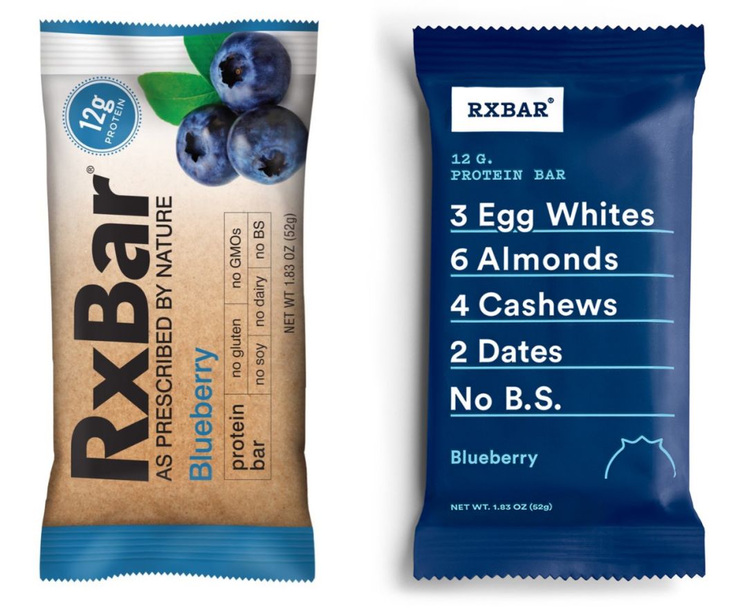 图片来源:RXBAR官网 原先,RXBAR 的包装设计中规中矩: 新鲜原料图片配上巨大的logo 以及产品说明。后来营销公司在为其重新定位时发现,消费者愿意购买的主要原因是 RXBAR 的天然健康成分,而不是品牌名声。因此创始人决定着重放大「NO B.S.(无添加,无多余成分)」的品牌承诺,同时将 RXBAR 标志缩小 60%。 比起巨大的logo,巨大的蓝莓或者“帮助你成为猛男”这样的标语,“3 个蛋白+6 个杏仁+4 个腰果+2 个枣”对现在的消费者来说更有吸引力。 新包装没有激发食欲的图片,也没有产品功效说明,只是简单地罗列出材料、用量、口味、和保质期。CEO Peter Rahal 解释道:「当时我们的想法很简单:只要诚实地告诉顾客,蛋白棒里有什么、没什么就好了,其余信息一概不用。」