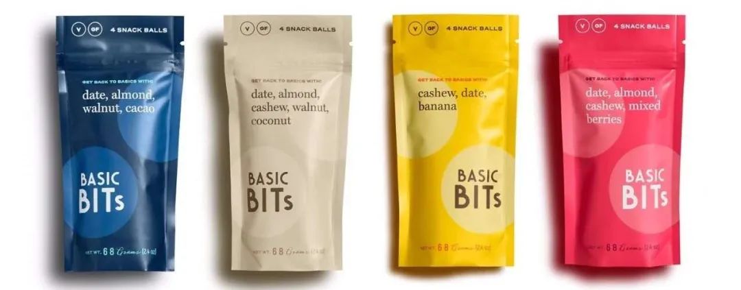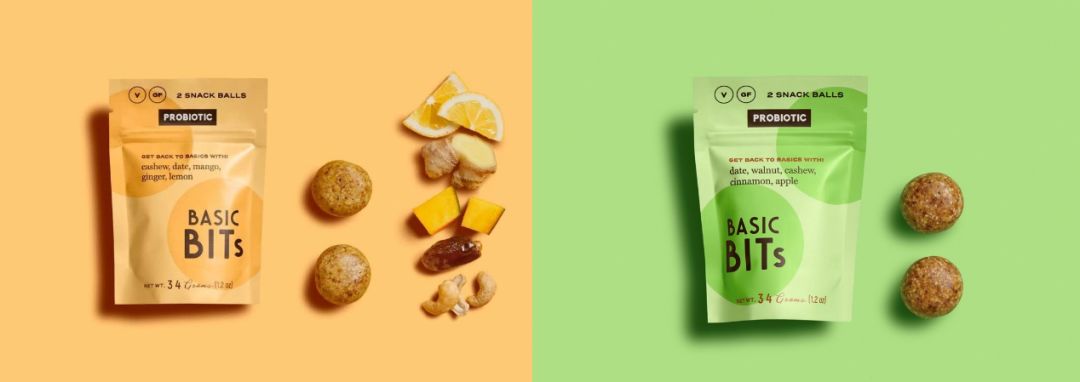 图片来源:Basic Bits官网 广告公司还为品牌拍摄了一组高度程式化的彩色照片,进一步强调了视觉概念。包装标识清晰明了,忠于品牌使命,用有序的,不紧不慢的态度准确的告诉你每个包装里有些什么。 在颜色的选择上,用基础调色盘中的颜色进一步加强了品牌返璞归真到基础成分的理念。该品牌的益生菌零食系列还衍生引入了一个二级调色板,大胆的颜色和简单的关键信息快速抓住消费者注意力。