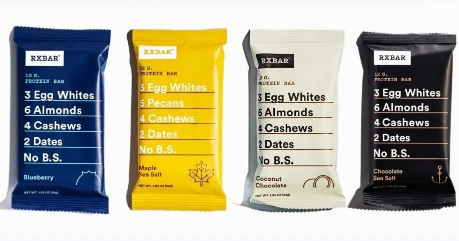 图片来源:农夫山泉天猫旗舰店 其包装设计完美体现了“高精科研感”,通身透明,没有过多着色和广告语,只有最显眼的锂水两个大字和成分介绍的小字,会让消费者产生“实验室里贴着标签的瓶子”这一最直观的关于高科技的联想。 4、清洁标签:越简单越好,告别花里胡哨的广告语 清洁标签这个词这两年在食品包装界几乎成为了最火的词之一,据全球领先的市场调研机构Research and Markets数据,2023年全球清洁标签市场将达475亿美元,年复合增长率为6.8%[8]。 “清洁标签”源于欧盟的一种主张,即在食品标签中,尽可能少出现E编码(食品添加剂),最大可能保持食品的天然属性。清洁标签的出现,其根本源头在于消费者对天然、健康的追求。 根据2018年L.E.K.的一项调查称,超过60%的消费者会选择标签上写着“不含人工成分”、“不含防腐剂”和“纯天然”的产品。2018年的Innova市场报告称,91%的美国消费者认为含有可识别成分的食品和饮料选择更健康。 消费者购买功能性食品的心态,和购买奶粉、宠物食品、儿童食品时的心态非常相似,在关注次序上,首要关注的都是营养成分和配方。其次才是口感和品牌风格。 了解了消费者这一价值排序后,在包装设计上直接把功效和成分列出来代替广告语的方式被越来越多的食品品牌采用。 随着消费者认知的升级,越来越多的消费者也能理解这些成分的名称和其代表的功效。在做出购买决定时,“成分”成为比品牌力和产品描述更重要的决定因素。 RXBAR创立于2013年,是一个生产能量棒的美国品牌,在2015 年营收只有650万美元,通过改变其包装,2017年营收增长到1.3亿美元的品牌[9]。