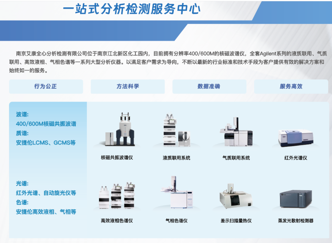 艾康全心 化学品第三方检测机构 提供一站式服务 分析检测、 南京艾康全心分析检测中心目前拥有国内xian进的高分辨率400M的核磁共振波谱仪,全套Agilent系列的液质联用仪、气质联用仪、高效液相仪、气相色谱仪以及各种理化分析仪器等一系列大型分析仪器。 在这里我们有高素质的管理团队、经验丰富的技术团队,检测中心将始终以满足客户需求为导向,不断以新的行业标准和技术手段为广大客户提供高效、快捷、直观、可靠的检测解决方案,并承诺以人性化、始终如一的服务为新老客户竭诚服务。